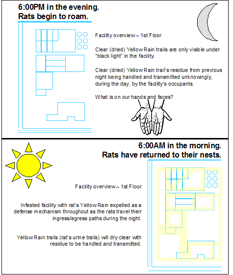 RAT YELLOW RAIN OVERVIEW: Infested facility overview with Yellow Rain Trails throughout... The diagram pictured above is for a for a typical facility. The same scenario takes place in all different types of facilities regardless of size and configuration where commensal rat infestations begin. |